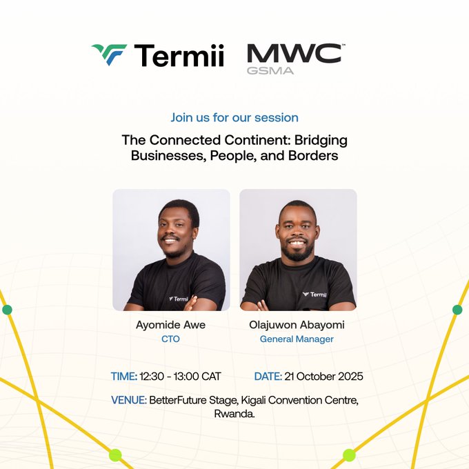 @termii_network Exciting times ahead! Join Termii at MWC Kigali 2025 as we unpack how technology is transforming cross-border communication and helping businesses reach people wherever they are. Our CTO, Ayomide Awe, and General Manager, Olajuwon Abayomi, will lead the session: “The Connectef7